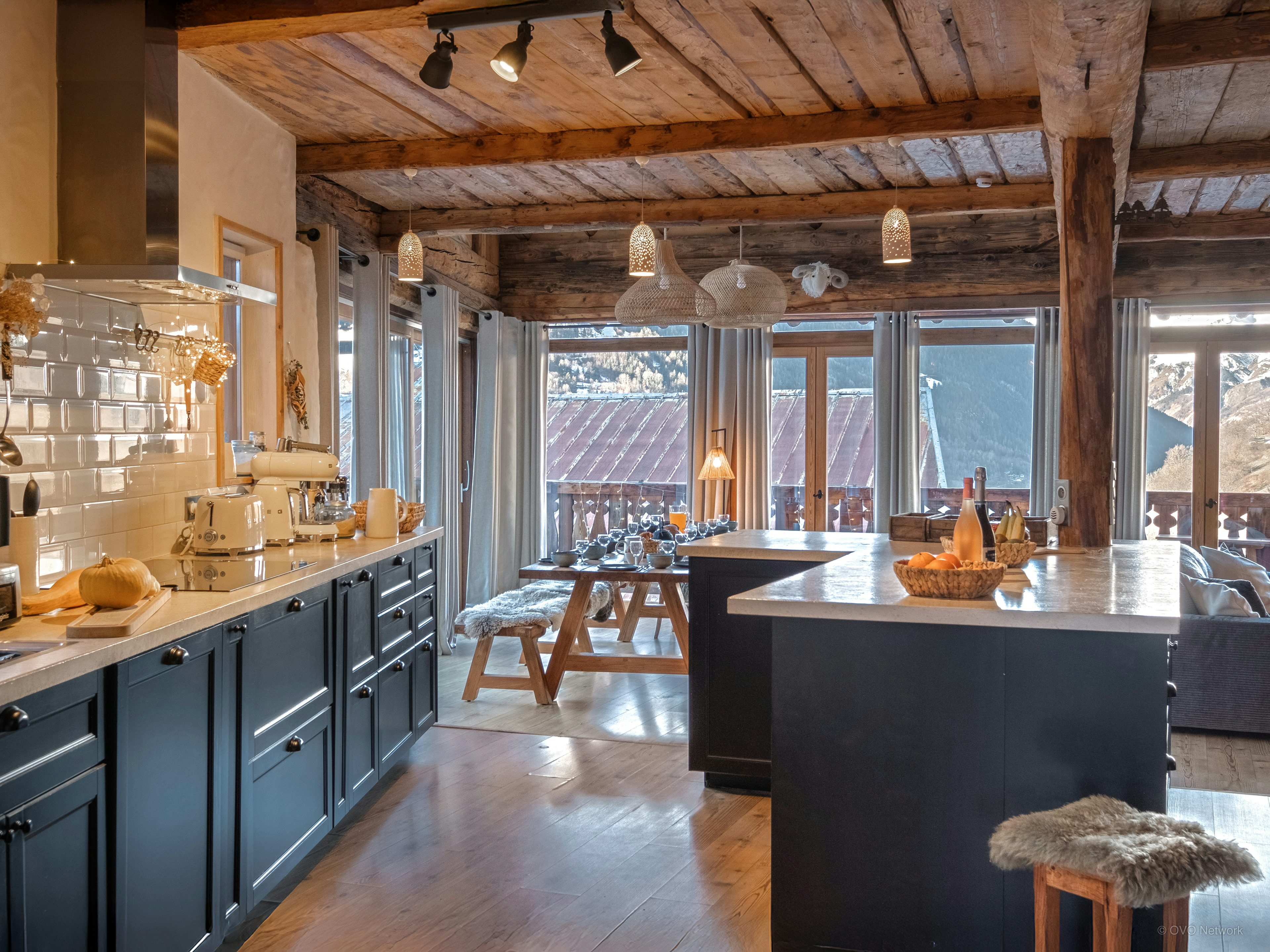 There's a large open-plan living area with great views of the Tarentaise peaks, two sitting areas where you can socialise or relax on your own, a fully-equipped kitchen with everything you need for raclette, fondue, fresh pasta and even wood-fired pizzas. The spacious bedrooms each have their own bath or shower rooms, you can relax in the sauna after skiing or walking, and there are ski lockers to store your equipment.